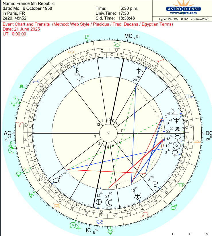 On June 21st, 2025–France’s biggest music festival and the day of the Summer Solstice—145 people were attacked with syringes in broad daylight. The rest of the world barely noticed, preoccupied with news of the three bunker busters the U.S. dropped on Iran. I was just as caught up in that as everyone else–until a short clip in a YouTube news video mentioned the syringe attacks in France. I became fascinated by how an attack that unfolded across nearly every major city in France–an act of mass violence targeting the public–was overshadowed by news of three precise, surgical strikes on Iran. As I poured over the natal and transit chart of France’s 5th Republic, what emerged was a 6th house profected into the 12th, a fallen Saturn, and a razor-sharp Mars-Pluto conjunction: the perfect storm for a public health threat hidden in plain sight.